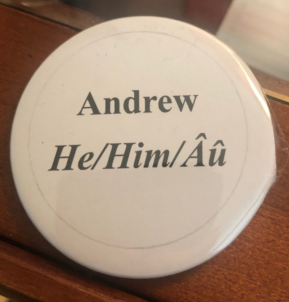 The counselors at the school where I work have been making a strong campaign to expand gender awareness and acceptance among students and staff. Part of their campaign involved making buttons for all the staff stating our preferred pronouns. It got me thinking long and hard about my use of personal pronouns and how they function as markers of identity. I realized that the traditional options didn’t do enough. If the button was going to be a symbol of my supporting people with complicated identities, it would be best if I were open about my own identity. I figured out a way that I felt good about. Here’s my button and the email I wrote to my colleagues about it: